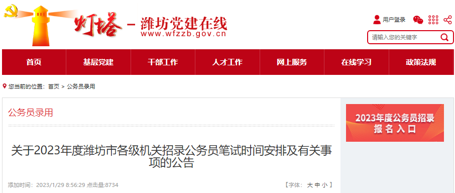 根據(jù)工作安排,2023年度濰坊市各級機關(guān)招錄公務(wù)員筆試定于2023年2月25日舉行?,F(xiàn)將有關(guān)事項公告如下: