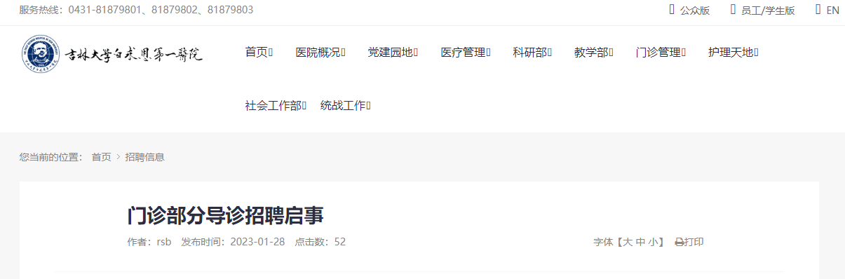 2023吉林大學(xué)白求恩第一醫(yī)院門診部分導(dǎo)診招聘,報(bào)名截止時(shí)間:2023年02月01日上午10:00,現(xiàn)將招聘公告原文發(fā)布如下:
