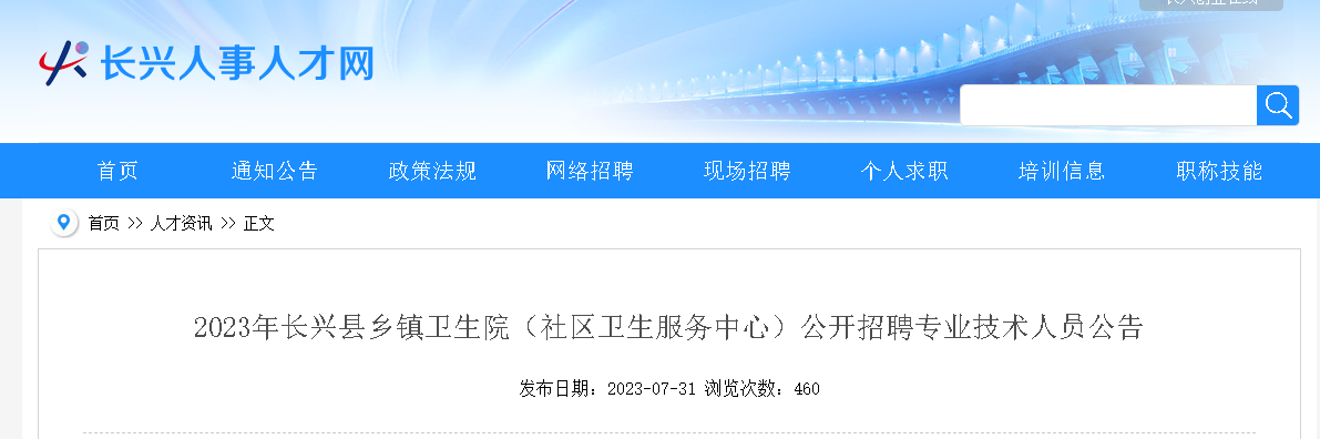 2023浙江湖州市長(zhǎng)興縣鄉(xiāng)鎮(zhèn)衛(wèi)生院(社區(qū)衛(wèi)生服務(wù)中心)招聘專(zhuān)業(yè)技術(shù)人員5人,報(bào)名時(shí)間:2023年8月9日-10日(上午8:30-11:30,下午14:00-17:00),現(xiàn)將招聘公告原文發(fā)布如下: