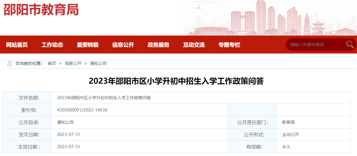 1.登錄邵陽市教育局網(wǎng)站(https://jyj.shaoyang.gov.cn/)主頁,查閱《關(guān)于印發(fā)<2023年邵陽市市區(qū)小學(xué)升初中招生入學(xué)工作實施方案>的通知》(邵教發(fā)〔2023〕23號)獲取相關(guān)信息;