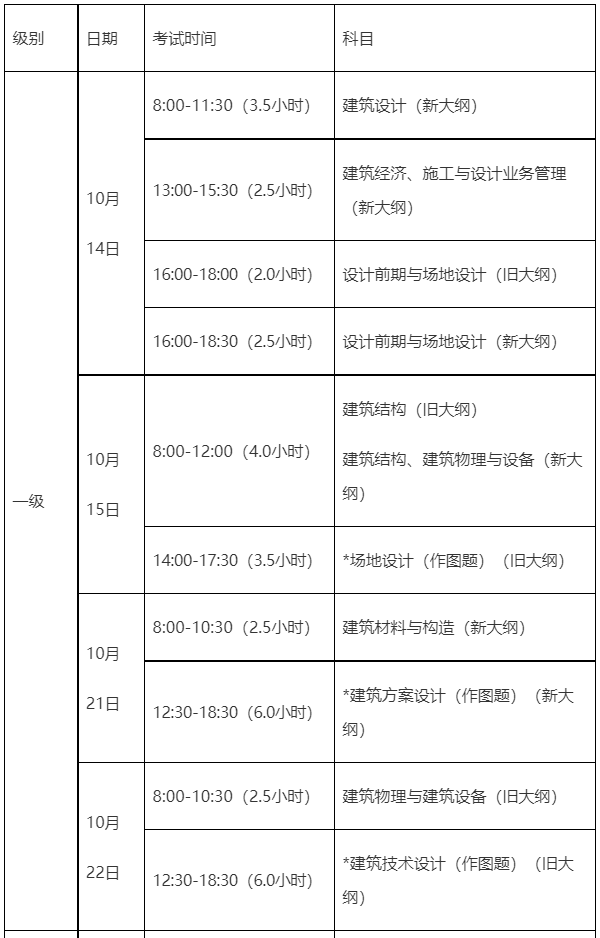 從湖南人事考試網(wǎng)發(fā)布的《2023年湖南全國(guó)一、二級(jí)注冊(cè)建筑師資格考試考務(wù)工作通知》中得知,2023年湖南一級(jí)注冊(cè)建筑師考試時(shí)間定于10月14日-15日、21日-22日舉行,一級(jí)注冊(cè)建筑師考試實(shí)行全國(guó)統(tǒng)一大綱、統(tǒng)一命題、統(tǒng)一組織的辦法。考試具體時(shí)間、科目安排如下: