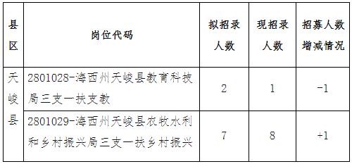 2023年海西州高校畢業(yè)生“三支一扶”計劃服務(wù)人員招募現(xiàn)場資格審查,部分崗位報考人員出現(xiàn)放棄或條件不符等情況。根據(jù)“三支一扶”計劃招募相關(guān)要求,對空缺崗位名額進(jìn)行調(diào)劑,并對現(xiàn)場資格審查空缺名額按筆試總成績從高到低依次遞補(bǔ)(資格審查只遞補(bǔ)一次),現(xiàn)將崗位名額調(diào)劑及遞補(bǔ)進(jìn)入現(xiàn)場資格審查環(huán)節(jié)的有關(guān)事項通知如下: