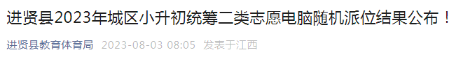 小升初頻道從進賢縣教育體育局了解到,江西南昌進賢縣2023年城區(qū)小升初統(tǒng)籌二類志愿電腦隨機派位結(jié)果公布。詳情如下: