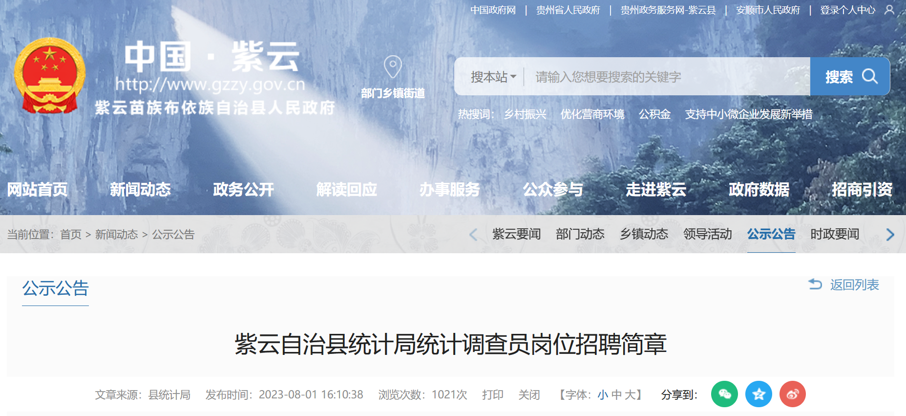 2023年貴州省安順市紫云自治縣統(tǒng)計(jì)局統(tǒng)計(jì)調(diào)查員崗位招聘7人。報(bào)名時(shí)間:2023年8月2日至4日?,F(xiàn)將公告原文發(fā)布如下: