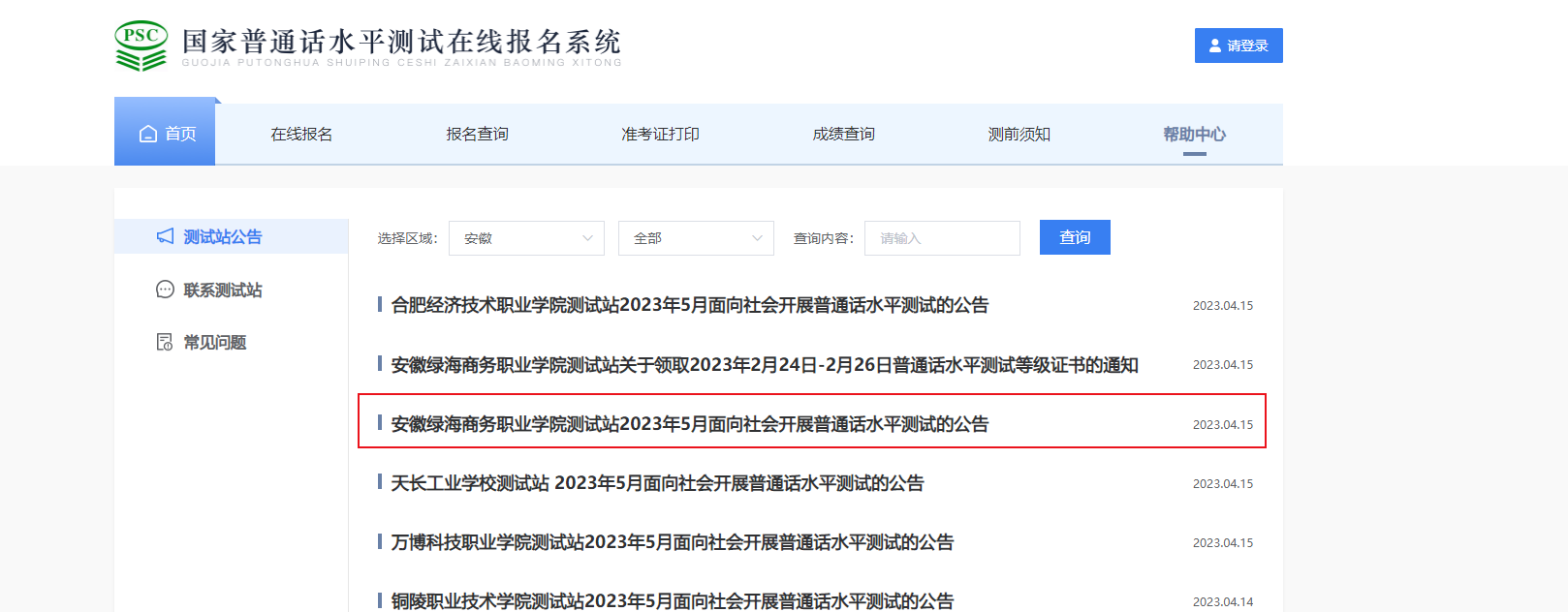 從國家普通話水平測試在線報名系統(tǒng)獲悉,2023年5月安徽綠海商務職業(yè)學院普通話報名時間及考試時間已公布,請相關(guān)人員仔細閱讀,具體詳情如下: