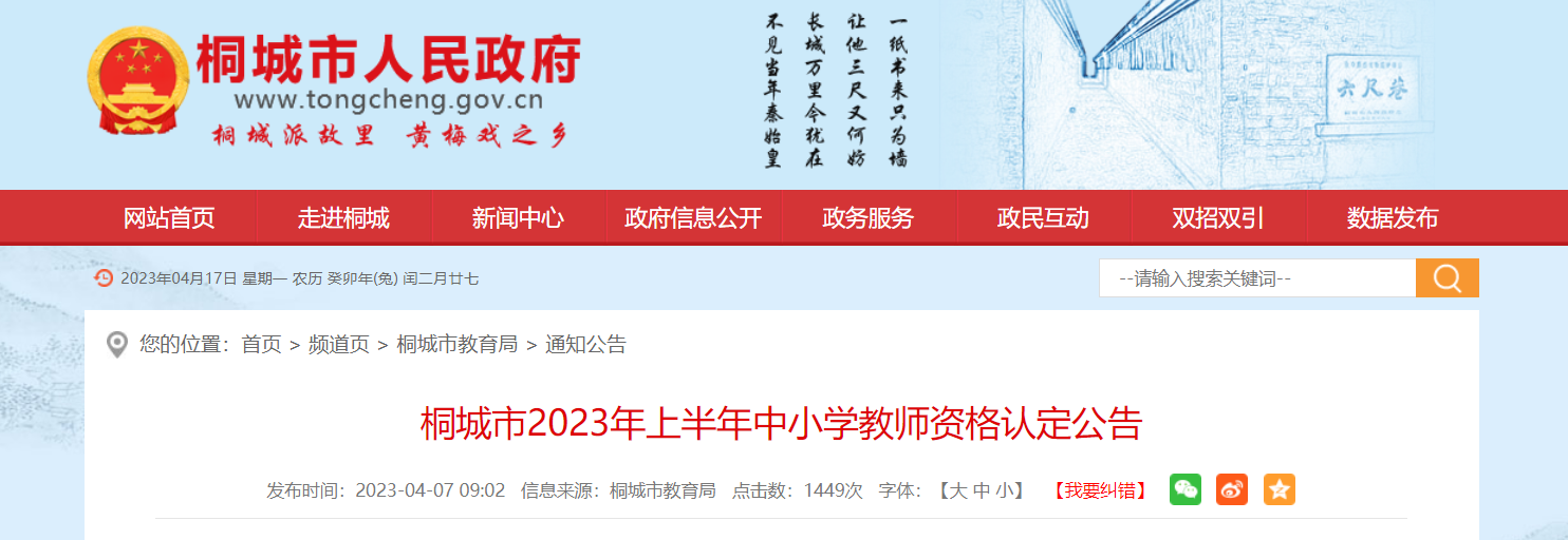 從桐城市人民政府獲悉,2023上半年安徽安慶桐城市中小學教師資格認定公告已公布,請相關人員仔細閱讀,具體詳情如下: