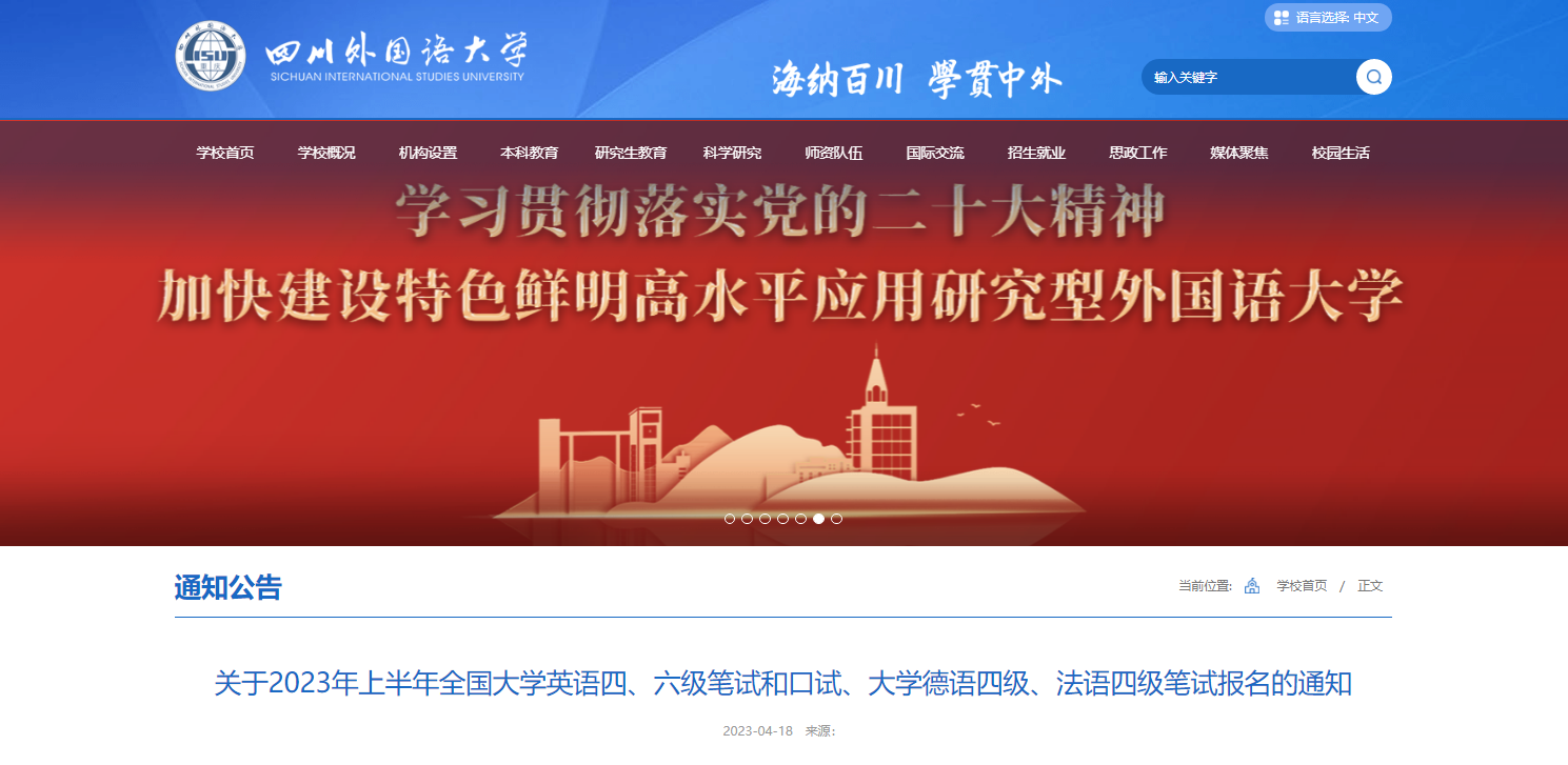 從四川外國語大學(xué)獲悉,2023上半年重慶四川外國語大學(xué)英語四、六級靠報名通知已公布,請相關(guān)人員仔細(xì)閱讀,具體詳情如下:
