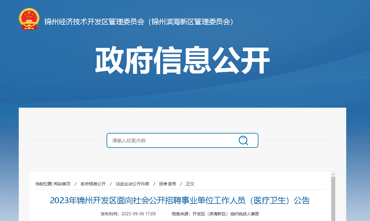 2023遼寧錦州開發(fā)區(qū)面向社會公開招聘事業(yè)單位工作人員(醫(yī)療衛(wèi)生)10人,報名時間:2023年9月9日9時至9月15日9時,現(xiàn)將招聘公告原文發(fā)布如下: