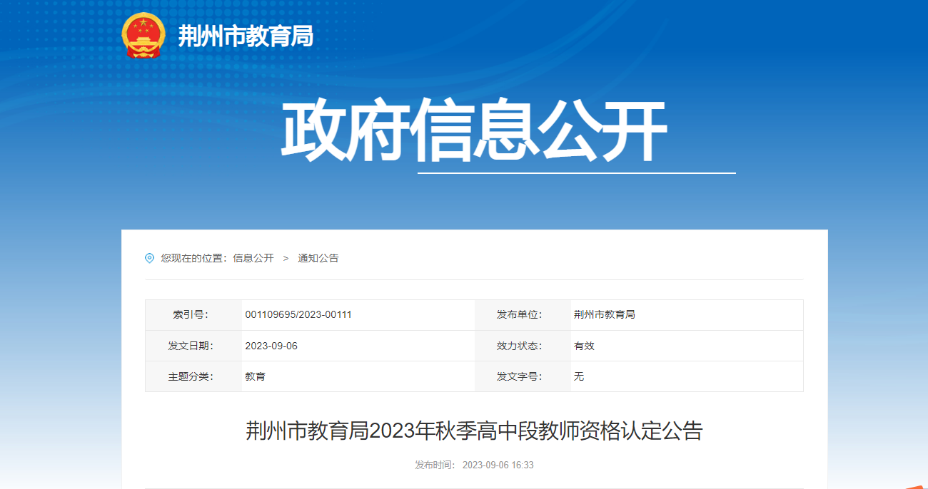 從荊州市教育局獲悉,2023年秋季湖北荊州市高中段教師資格認(rèn)定公告已公布,請相關(guān)人員仔細(xì)閱讀,具體詳情如下: