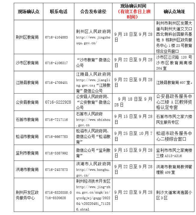 九、荊州市教師資格認(rèn)定高中段現(xiàn)場確認(rèn)點(diǎn)聯(lián)系方式及公告發(fā)布途徑