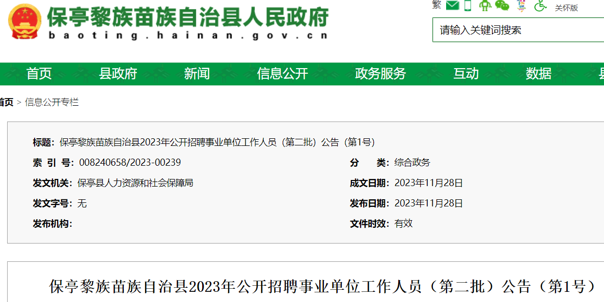 通過保亭黎族苗族自治縣人民政府網(wǎng)站(https://baoting.hainan.gov.cn/)發(fā)布招聘公告。公告時間:2023年11月28日至12月4日,公告時間為7天。