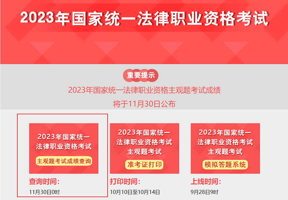 從司法部發(fā)布的《2023年國(guó)家統(tǒng)一法律職業(yè)資格主觀題考試成績(jī)、合格分?jǐn)?shù)線公布以及申請(qǐng)授予法律職業(yè)資格等事宜的公告》得知,2023年西藏法考主觀題考試成績(jī)查詢?nèi)肟谝验_通,入口開通時(shí)間為11月30日0時(shí)起,具體詳情如下: