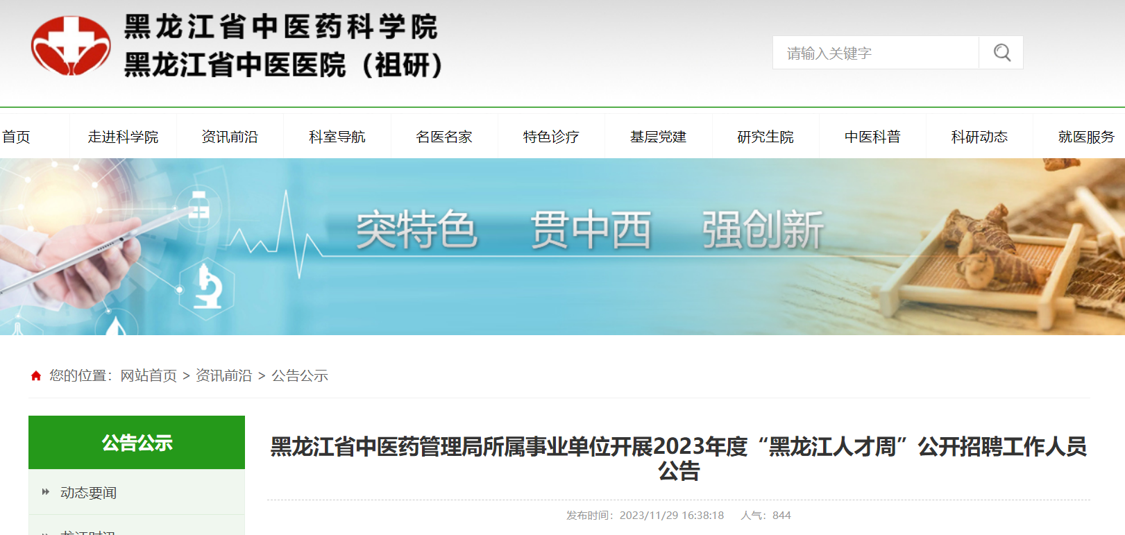 《黑龍江省中醫(yī)藥管理局所屬事業(yè)單位省中醫(yī)藥科學(xué)院開展2023年度“黑龍江人才周”公開招聘工作人員公告》將在黑龍江省中醫(yī)藥管理局(http://tcm.hlj.gov.cn/)和黑龍江省中醫(yī)藥科學(xué)院網(wǎng)站(http://hljstcm.org.cn/)發(fā)布,提示性信息在黑龍江省人力資源和社會(huì)保障廳網(wǎng)站發(fā)布。