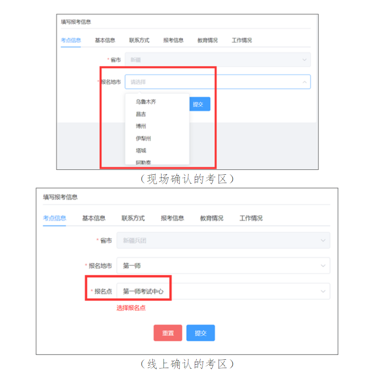 (1)下拉選擇“報名地市”。非線上確認考區(qū)的考生只需選擇“報名地市”。采用線上確認方式的考區(qū),考生須選擇網(wǎng)上確認的報名點。