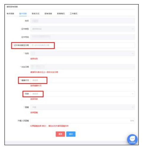 (2)基本信息會根據(jù)考生注冊時填寫的信息自動判斷引用,性別、出生日期如未引用,考生可手動選擇,民族和健康狀態(tài)請根據(jù)實際情況下拉選擇。