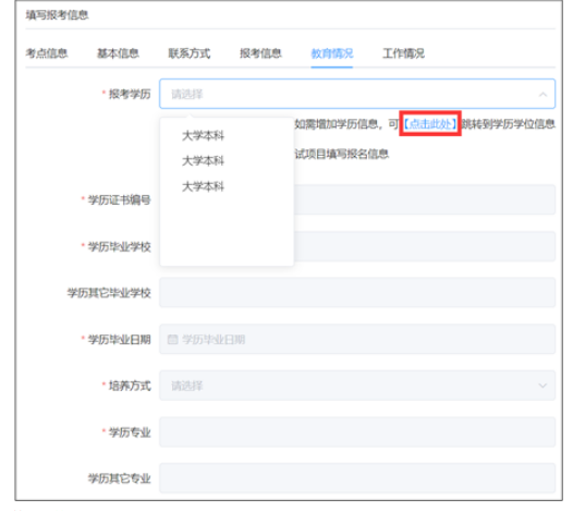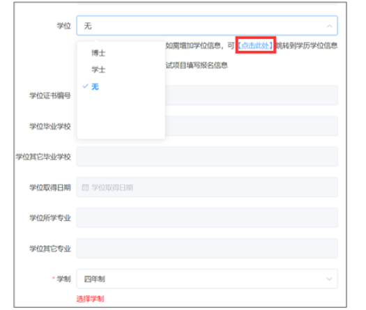 (5)學(xué)歷和學(xué)位相關(guān)信息下拉選擇,引用基本信息中【學(xué)歷學(xué)位信息維護】的內(nèi)容。如需修改,請在學(xué)歷學(xué)位信息維護頁面進行操作,完成后再次進入考試項目填寫報名信息,引用正確的學(xué)歷和學(xué)位信息。