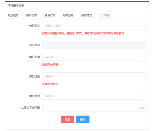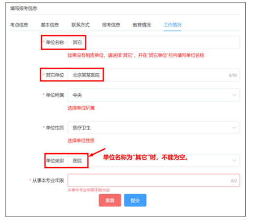 (6)如實填寫工作情況,包括“單位名稱”、“單位所屬”、“單位性質(zhì)”、“單位類別”和“從事本專業(yè)年限”;單位名稱為“其它”時,單位類別不能為空。