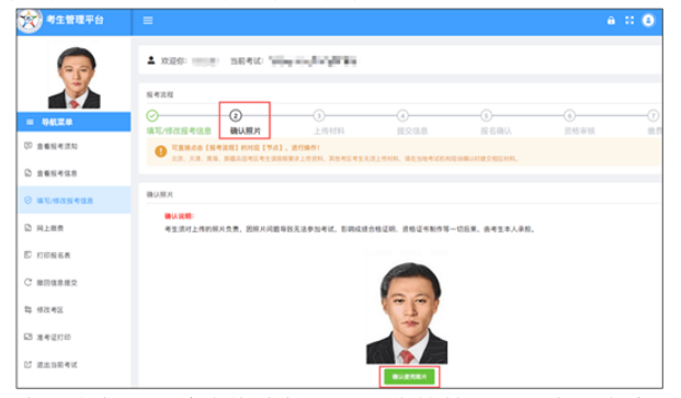 (7)以上信息提交后,系統(tǒng)會自動跳轉(zhuǎn)至確認照片頁面,也可點擊【報考流程】中的“確認照片”節(jié)點。