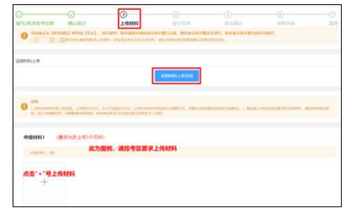 (8)確認照片后,采用線上確認的考區(qū),系統(tǒng)將跳轉(zhuǎn)至【上傳材料】頁,也可點擊【報考流程】中的“上傳材料”節(jié)點,進入上傳材料頁面,請考生按照考區(qū)的要求上傳相關(guān)證明材料,材料上傳完成后,點擊“提交報名信息”。