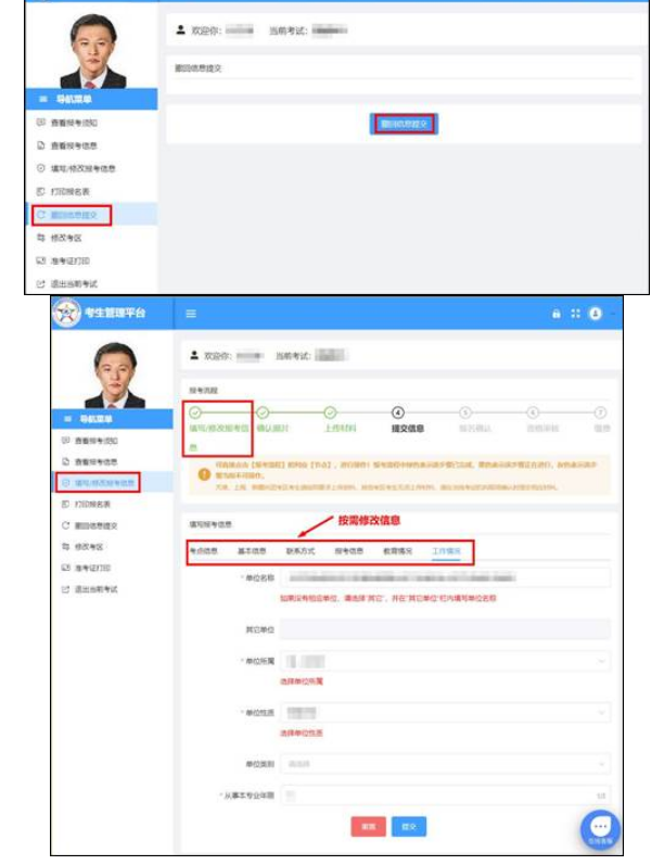 未進行報名確認的考生,可在報名確認結(jié)束前,點擊【撤回信息提交】,通過【填寫/修改報考信息】功能修改相應(yīng)信息,修改完成后再次提交。