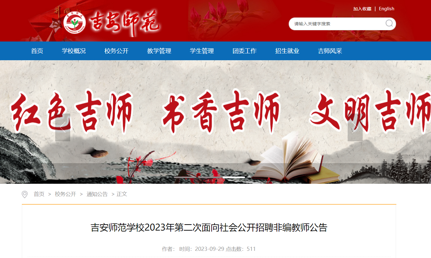 2023年江西吉安師范學(xué)校第二次面向社會(huì)公開招聘非編教師公告已發(fā)布,報(bào)名時(shí)間:發(fā)布公告起至2023年10月13日12:00?,F(xiàn)將招聘公告原文發(fā)布如下: