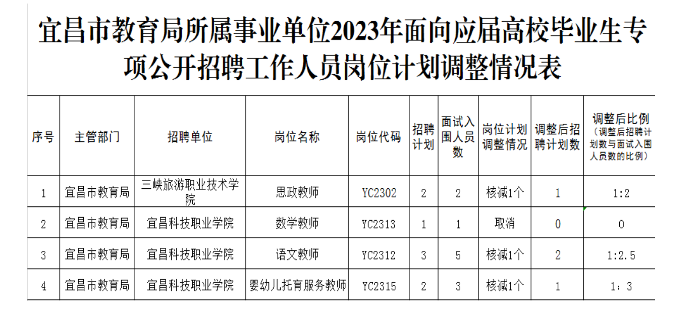 按照《宜昌市事業(yè)單位2023年面向應屆高校畢業(yè)生專項公開招聘工作人員公告》關于面試入圍比例的規(guī)定,根據(jù)筆試成績從高到低的順序,對于《宜昌市事業(yè)單位2023年面向應屆高校畢業(yè)生專項公開招聘工作人員崗位表(市直)》中未達到規(guī)定比例的崗位,經(jīng)招聘單位申請,現(xiàn)對三峽旅游職業(yè)技術學院、宜昌科技職業(yè)學院崗位計劃調(diào)整情況予以公告,具體崗位計劃的保留、核減、取消情況詳見附件。附件:宜昌市教育局所屬事業(yè)單位2023年面向應屆高校畢業(yè)生專項公開招聘工作人員崗位計劃調(diào)整情況表.xls