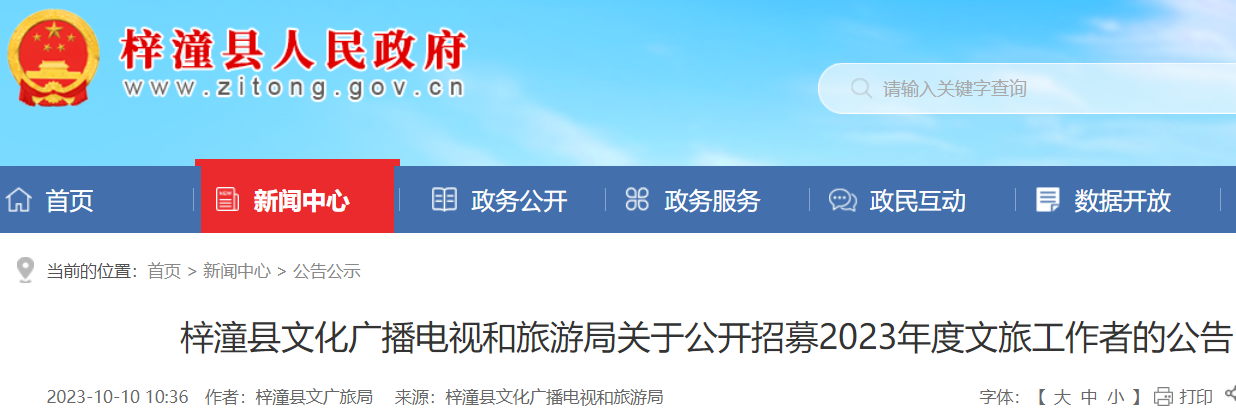 小編根據(jù)梓潼縣文化廣播電視和旅游局發(fā)布“梓潼縣文化廣播電視和旅游局關(guān)于公開招募2023年度文旅工作者的公告”得知,2023四川綿陽市梓潼縣文化廣播電視和旅游局招募文旅工作者1人,報名時間為10月10日至10月16日。