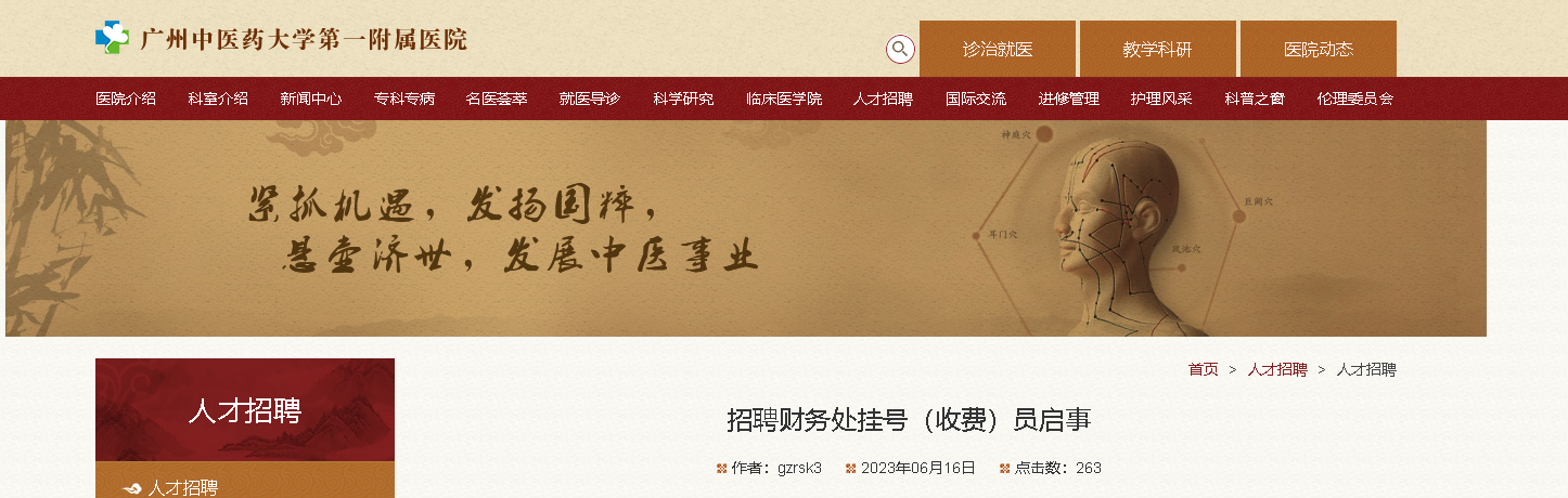 2023廣東廣州中醫(yī)藥大學(xué)第一附屬醫(yī)院招聘財務(wù)處掛號(收費)員3人,報名截止時間:7月7日前,現(xiàn)將招聘啟事原文發(fā)布如下: