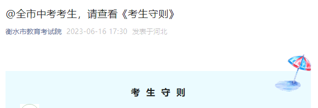 從衡水市教育考試院公眾號了解到,2023年河北衡水中考考生守則公布,詳細內(nèi)容如下: