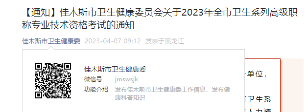 從佳木斯市衛(wèi)生健康委公眾號獲悉,2023年黑龍江佳木斯衛(wèi)生系列高級職稱專業(yè)技術資格考試通知已公布,現場確認時間5月30日-31日,具體詳情如下: