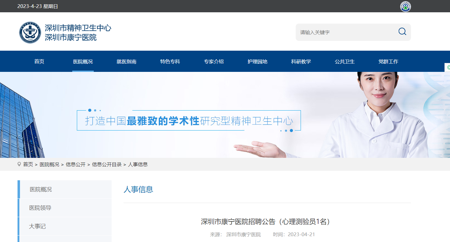 2023廣東深圳市康寧醫(yī)院招聘心理測(cè)驗(yàn)員1名,報(bào)名時(shí)間:公告發(fā)布之日起至2023年4月27日止,逾期報(bào)名不再受理,現(xiàn)將招聘公告原文發(fā)布如下:
