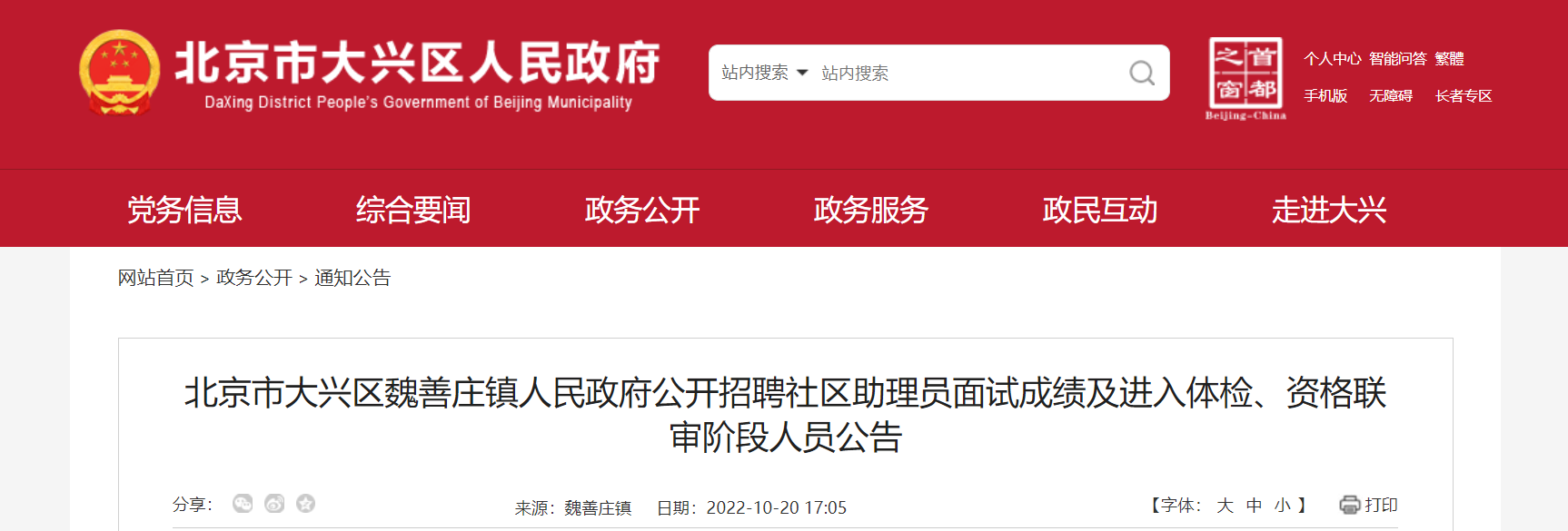 原文標題:北京市大興區(qū)魏善莊鎮(zhèn)人民政府公開招聘社區(qū)助理員面試成績及進入體檢、資格聯(lián)審階段人員公告