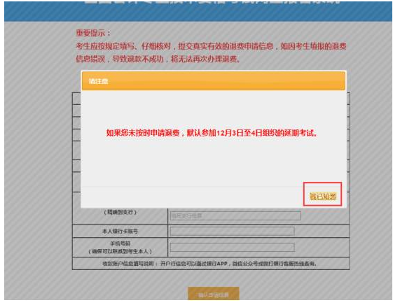 考生輸入正確的驗證碼后,點擊“下一步”,確認(rèn)個人信息,針對??嫉貐^(qū),會彈窗提示“如果您未按時申請退費,默認(rèn)參加12月3日至4日組織的延期考試”,如下圖所示: