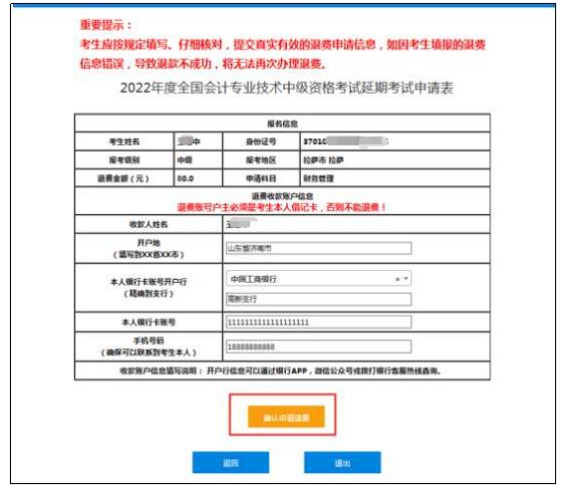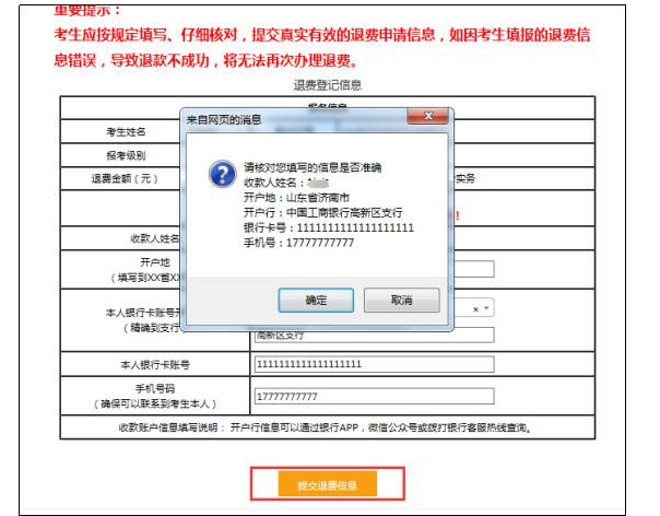 如考生申請退費,需輸入正確的退費賬戶開戶地、開戶行、銀行卡賬號、手機(jī)號碼等退費信息后,點擊“確認(rèn)申請退費”按鈕,考生核對填寫的信息準(zhǔn)確后,點擊確定,會如下圖所示: