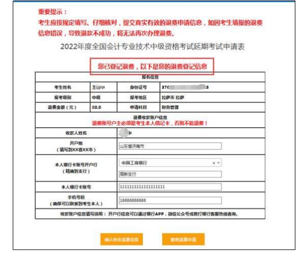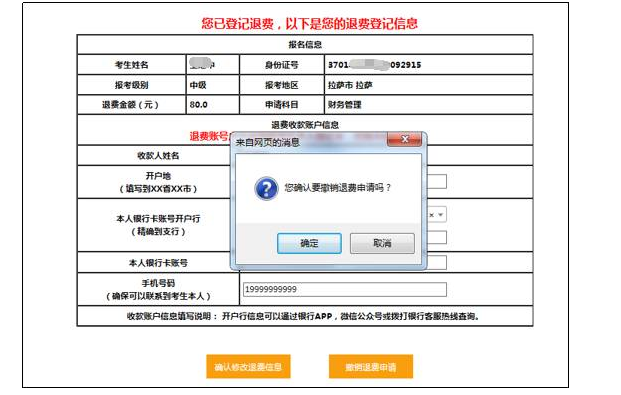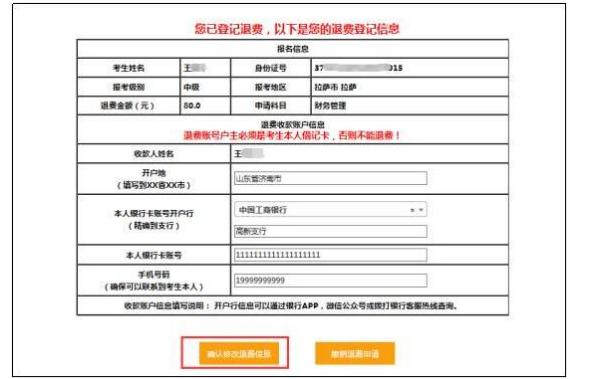 登記系統(tǒng)開放期間,考生可以登錄系統(tǒng)修改退費信息。如下圖所示: