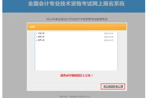 考生進(jìn)入后,首先看到的是公告框。該公告框里面的內(nèi)容是由各地考試管理機(jī)構(gòu)發(fā)布的公告。考生仔細(xì)閱讀后,點擊“我已閱讀所有公告”按鈕,會看到考生的詳細(xì)信息,如下圖所示: