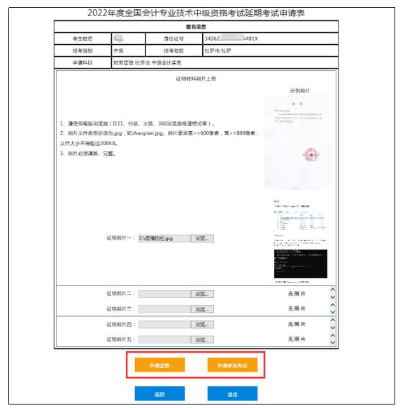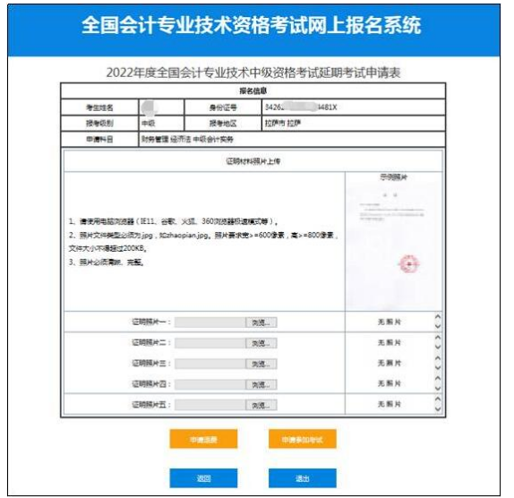 系統(tǒng)進(jìn)入延期考試申請表填寫頁面,考生根據(jù)實際情況,按照考試管理機(jī)構(gòu)公告要求上傳相應(yīng)的證明文件照片,系統(tǒng)支持五個證明照片文件的上傳,證明文件具體要求請參考各省發(fā)布的公告。如下圖所示: