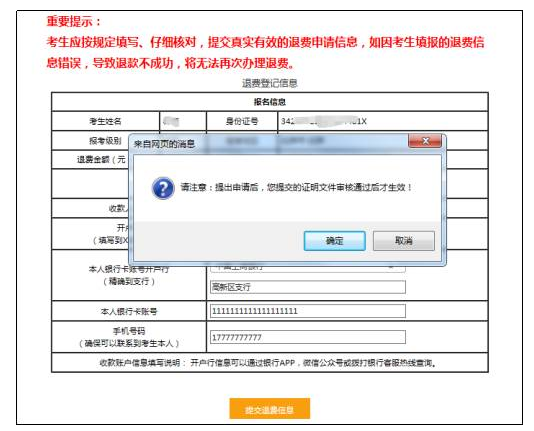 最后會提示“提出申請后,您提交的證明文件審核通過才生效”窗口,點擊確定,退費信息登記成功。如下圖所示: