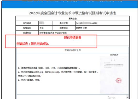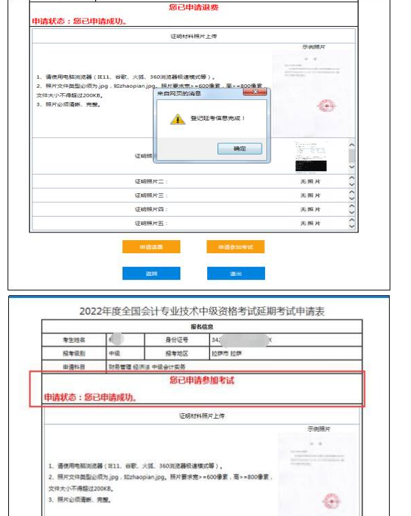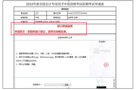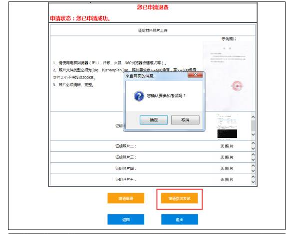 上傳完證明材料照片后,點擊“申請退費”或“申請參加考試”按鈕進(jìn)行申請操作,如下圖所示: