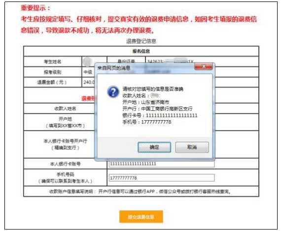 考生核對填寫的信息準(zhǔn)確后,點擊確定,再次點擊確定,會提示退費信息登記成功。如下圖所示: