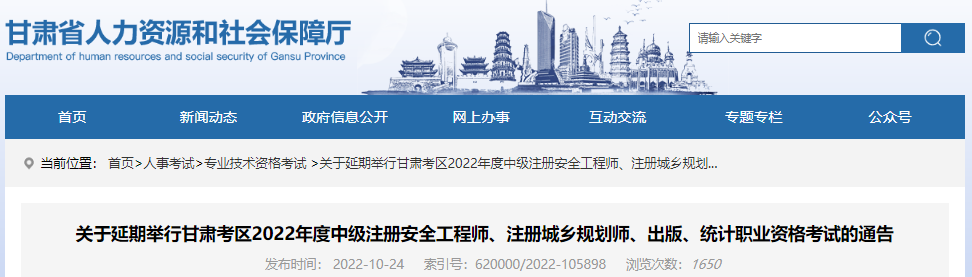 原文標(biāo)題:關(guān)于延期舉行甘肅考區(qū)2022年度中級(jí)注冊(cè)安全工程師、注冊(cè)城鄉(xiāng)規(guī)劃師、出版、統(tǒng)計(jì)職業(yè)資格考試的通告