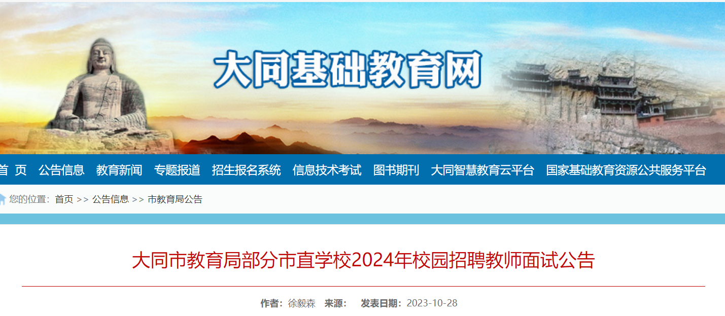 2024年山西大同市教育局部分市直學(xué)校校園招聘教師面試公告已發(fā)布,打印面試準(zhǔn)考證時(shí)間:2023年10月29日9:00—2023年11月6日7:30。現(xiàn)將原文發(fā)布如下: