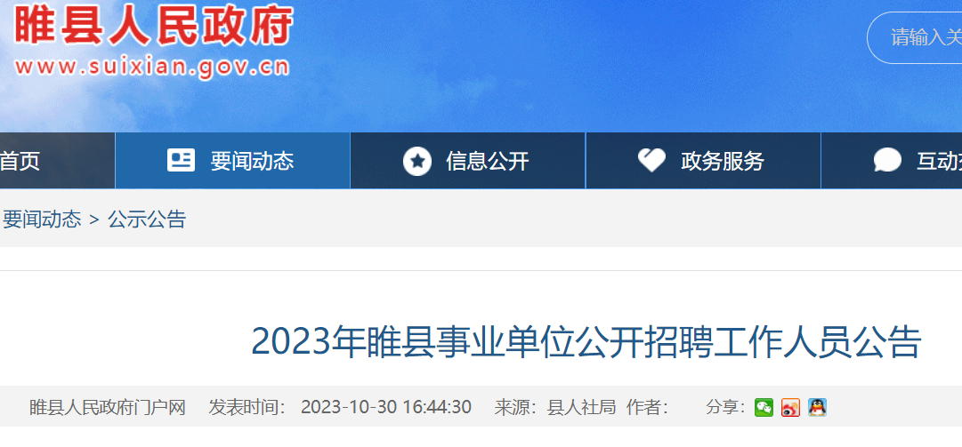 小編根據(jù)睢縣人民政府發(fā)布“2023年睢縣事業(yè)單位公開招聘工作人員公告”得知,2023年河南睢縣事業(yè)單位公開招聘工作人員60名,報名時間為11月4日-6日。