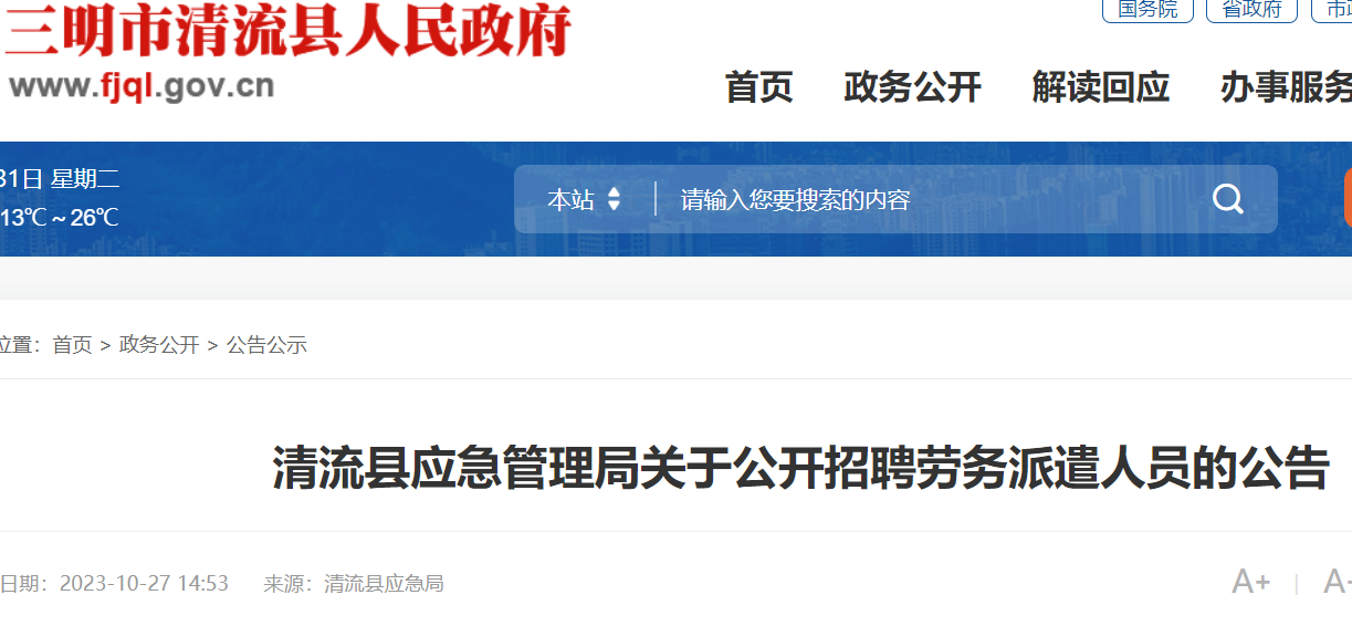 清流縣應(yīng)急管理局?jǐn)M面向社會(huì)公開(kāi)招聘勞務(wù)派遣工作人員1名,現(xiàn)將有關(guān)事項(xiàng)公告如下: