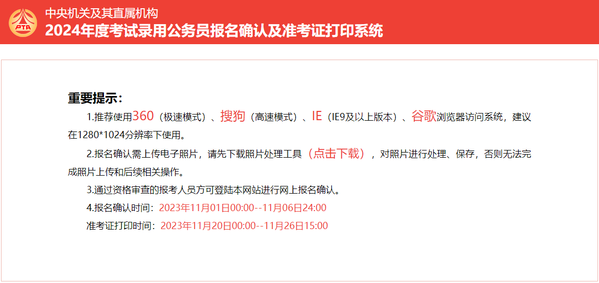 從國家公務(wù)員局獲悉,2024年西藏國考報名確認(rèn)時間為2023年11月1日0:00至11月6日24:00,在此期間考生通過報名網(wǎng)站,選擇“考生考務(wù)入口”(報名確認(rèn)及準(zhǔn)考證打印網(wǎng)址)進入,現(xiàn)將2024年國考報名確認(rèn)入口提供給大家。
