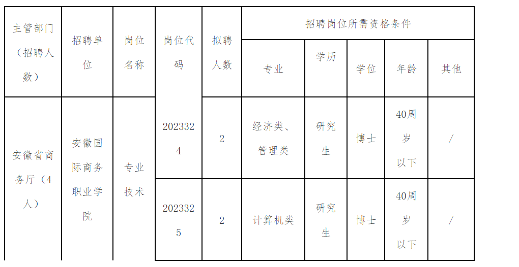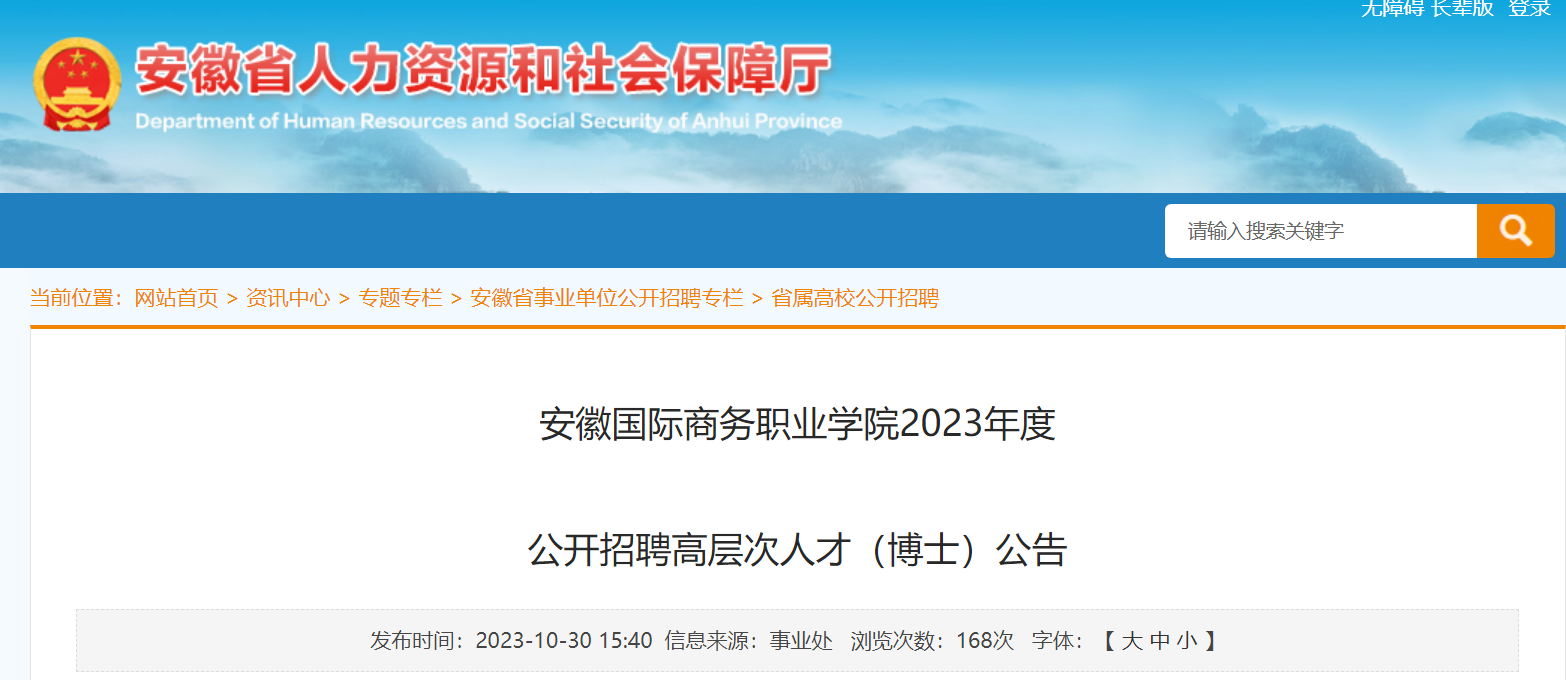 (一)安徽省人力資源和社會(huì)保障廳、安徽省商務(wù)廳、安徽國(guó)際商務(wù)職業(yè)學(xué)院等網(wǎng)站發(fā)布招聘公告,報(bào)名截止時(shí)間為2023年11月30日。