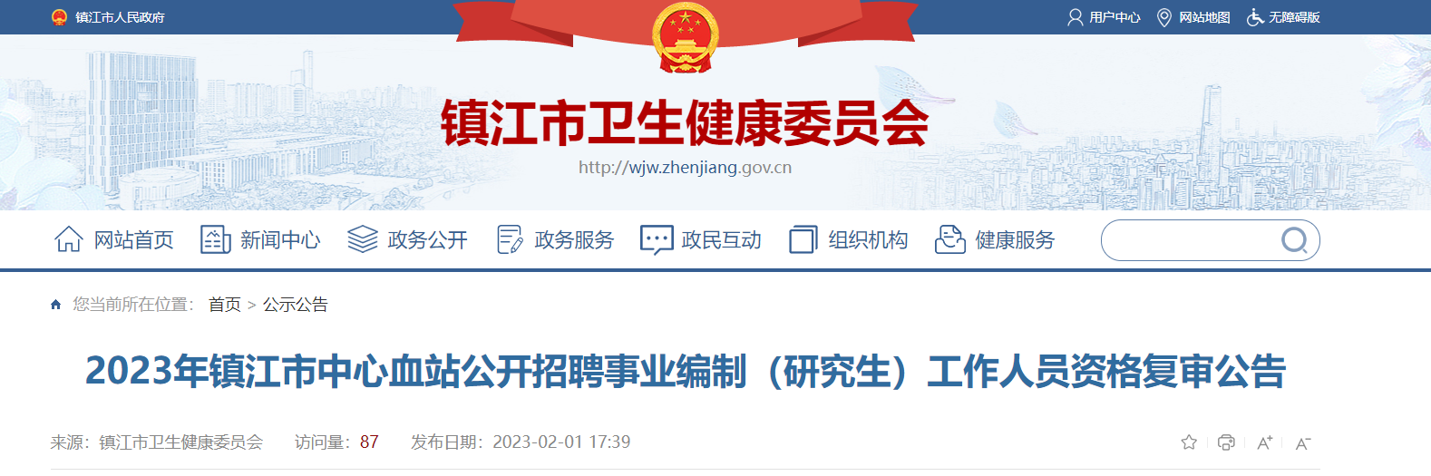2023江蘇鎮(zhèn)江市中心血站招聘事業(yè)編制(研究生)工作人員資格復(fù)審時間已公布,資格復(fù)審時間:2月6日-2月13日工作日8:30-16:00,現(xiàn)將招聘公告原文發(fā)布如下: