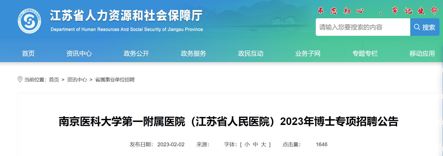 2023年江蘇南京醫(yī)科大學(xué)第一附屬醫(yī)院(江蘇省人民醫(yī)院)博士專項(xiàng)招聘,報(bào)名、照片上傳:2023年2月6日9∶00-2月15日12∶00,現(xiàn)將招聘公告原文發(fā)布如下: