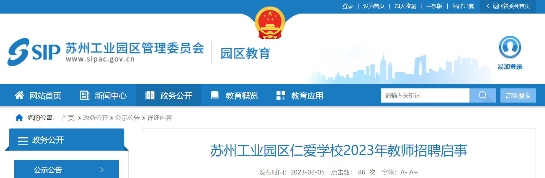 2023年江蘇蘇州工業(yè)園區(qū)仁愛學校教師招聘啟事已發(fā)布,詳細地址:蘇州工業(yè)園區(qū)仁愛學校(蘇州工業(yè)園區(qū)荷韻街9號),現(xiàn)將招聘公告原文發(fā)布如下: