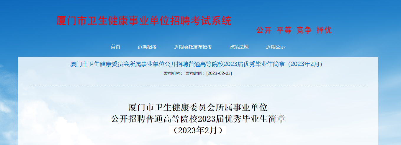 根據(jù)《廈門市事業(yè)單位補(bǔ)充工作人員暫行規(guī)定》和國家、省、市關(guān)于做好高校畢業(yè)生就業(yè)保障的有關(guān)精神,廈門市衛(wèi)生健康委員會決定組織所屬事業(yè)單位擇優(yōu)招聘普通高等院校2023屆優(yōu)秀畢業(yè)生?,F(xiàn)將招聘簡章公布如下: